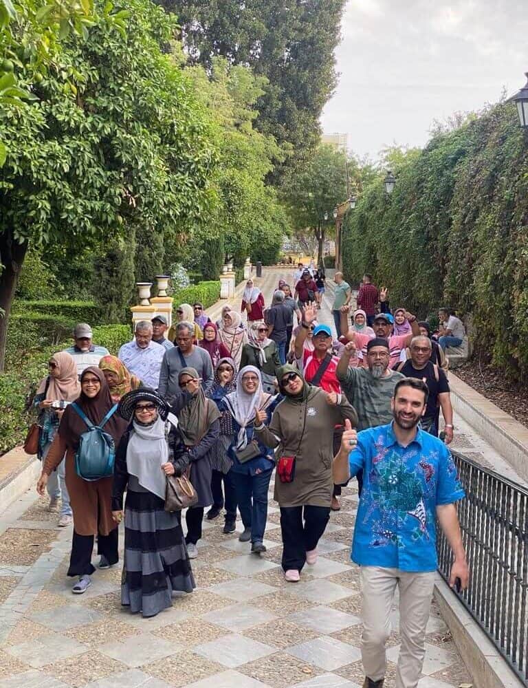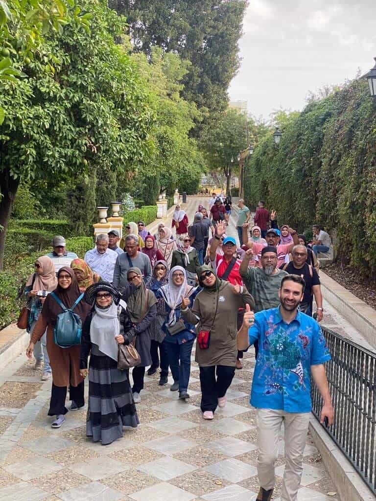 Teruskan ke Seville (2: 30j). Ketibaan ke Seville dan lawatan ke: Plaza España, Jardines de Murillo, kuarters Muslim (Masa lapang untuk membeli-belah cenderahati), Giralda Tower (fotostop).